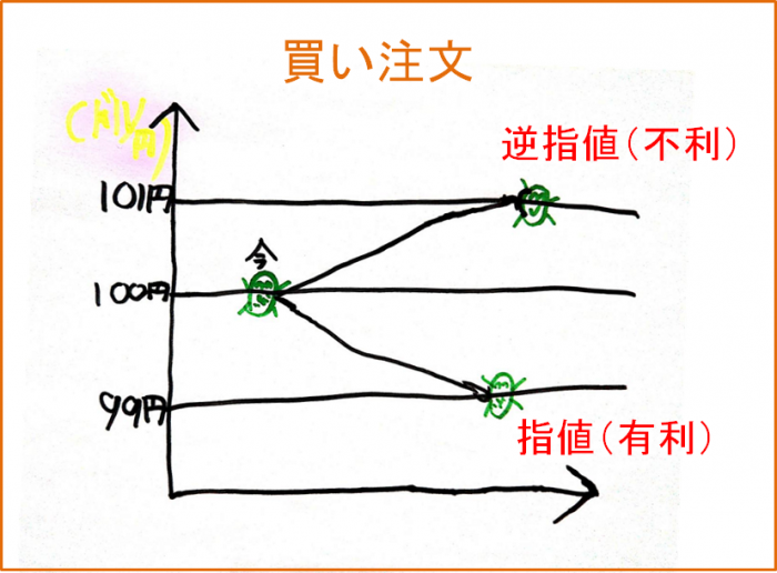 チャートで説明すると、買い注文の場合今の値段より「安く買う(有利)」場合が「指値」「高く買う(不利)」場合が「逆指値」となります。