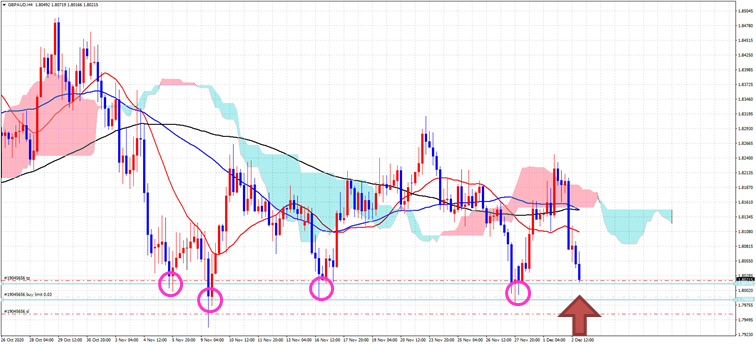 ①移動平均線のSMA100が横ばい、SMA50と20が交互に交差している。②一目均衡表の雲が反転を繰り返していることから、レンジ相場であると判断できます。また、過去に意識されている価格帯があり、チャートが反発しているのが分かります(ピンク丸)。現在はその価格帯に向かって下降中であり、反発上昇が期待できそうって感じの相場です。