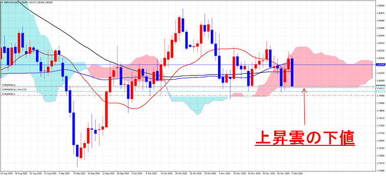 4時間足同様に、移動平均線と一目均衡表の雲からレンジ相場と判断できます。また、上昇雲の下値付近であり、反発上昇の後押し材料になると考えられます。