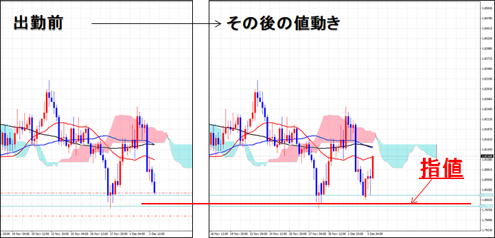 きゅうりパパは、朝起きたらチャートを見るようにしています。「これは、チャンスが近い…」と、きゅうりぱぱが気になった通貨ペアは GBP/AUD でした。出勤するまでにチャンスがあるかと、身支度をする間もチラチラとチャートを見ながら準備をします。しかし、無情にも出勤の時間が。こんな時に力を発揮するのがIFO注文です!