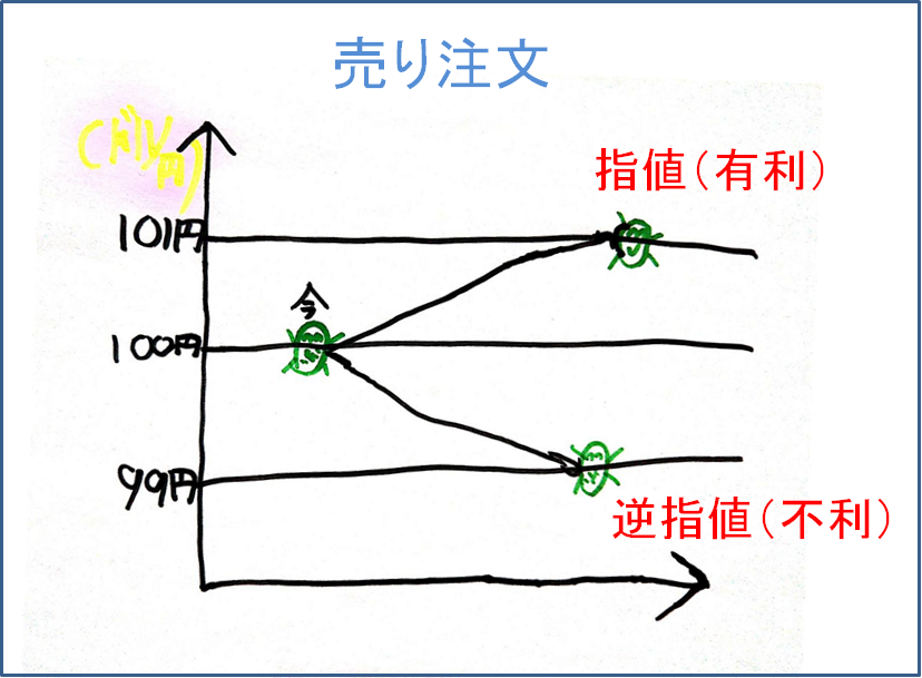 売り注文の場合今の値段より「高く売る(有利)」場合が「指値」「安く売る(不利)」場合が「逆指値」となります。