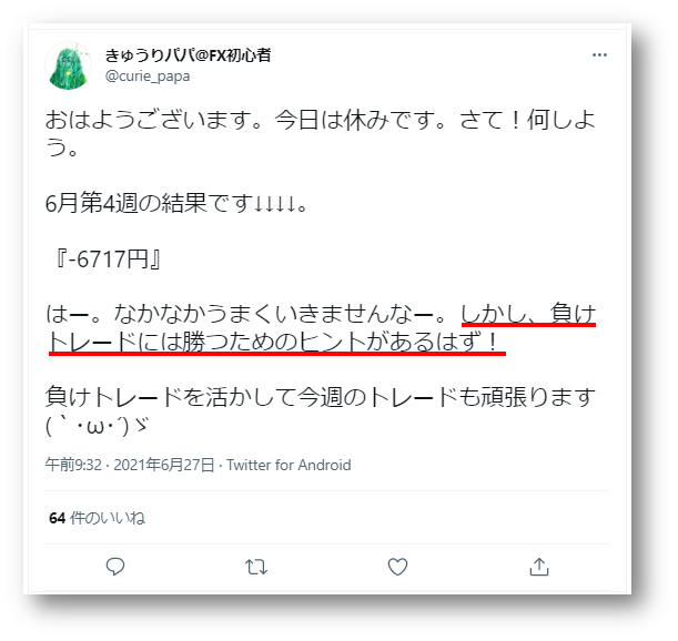 ということで、6月第4週の負けトレードを振り返って、これからのトレードに活かしていきたいと思います。ここまで読んで、きゅうりパパのトレードについてちょっとでも興味が沸いた方は、是非!Twitterもフォロー宜しくお願いします。
