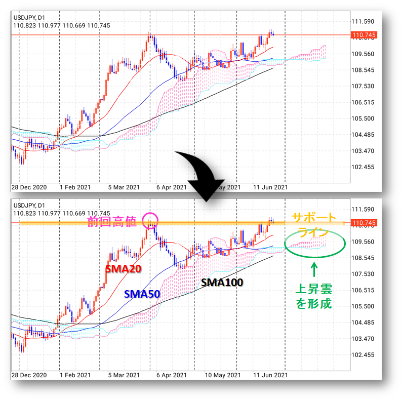 まずは、日足からです。前回高値を更新し、111円の壁を突破したところで高値を付けています。すべての移動平均線(SMA20、50、100)が斜め上方を向いていることと、上昇雲を形成していることから勢いの強さが伺えます。現在は、陰線となり下降していますが、前回高値がサポートラインとして働き、さらに上昇すると考えました。