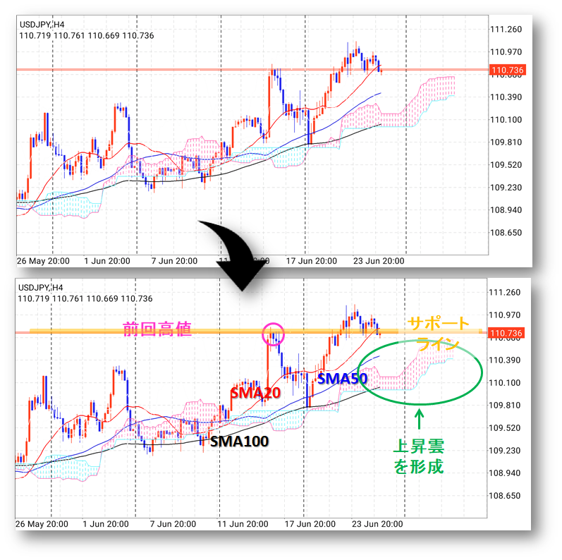 次に4時間足を見ていきます。全ての移動平均線(SMA20、50、100)が斜め上方を向いており、上昇雲を形成していることから上昇トレンドと判断します。SMA20を下抜けているものの、前回高値をサポートラインとして買い支えられていることがわかります。