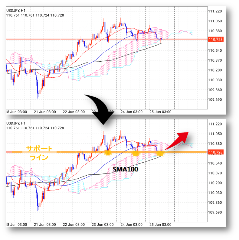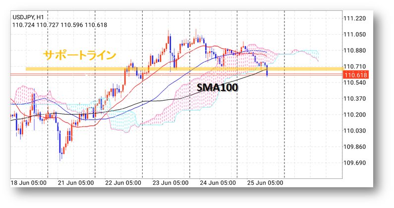 1時間足も見てみましょう。日足&4時間足で機能していたサポートラインで反発していることが1時間足でも確認することができます。そして、現在もサポートライン付近にあります。さらに、SMA100に接近しており、サポートライン&SMA100により反発上昇すると考えました。
