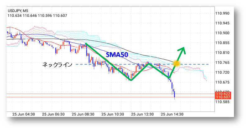 ちょっとイメージと違いましたねw。SMA50で抑えられたとしても、その後にダブルボトムを形成したことを、こんな感じ(緑ライン)でしっかり確認してからエントリーしたかったですね。IFO注文なので仕方ないですね。
