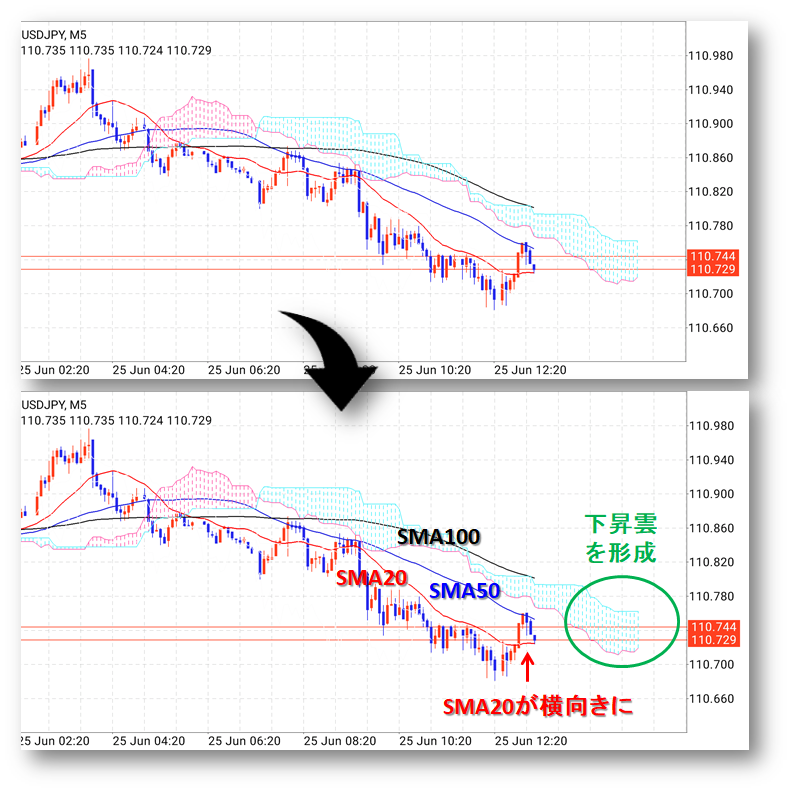 最後に5分足です。全ての移動平均線(SMA20、50、100)が斜め下方を向いており、下降雲を形成していることから下降トレンドと判断します。しかし、現在はSMA20が横向きになっており、直近の下降する勢いが弱まってきています。また、SMA20を上抜けており、上昇に転じる可能性が示唆されます。