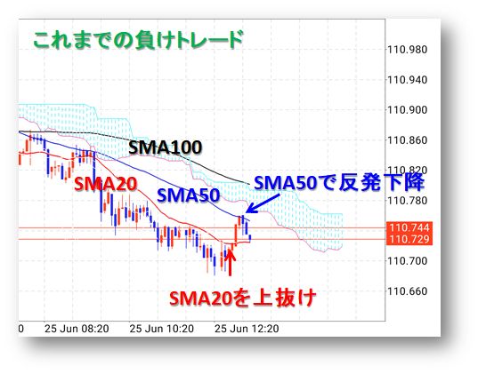 これまでの負けトレードでは、SMA20を上抜けたタイミングでエントリーしていました。しかし、5分足はあくまで下降トレンド中なので、SMA50で抑えられてそのまま下降トレンド継続というパターンが多かったです。