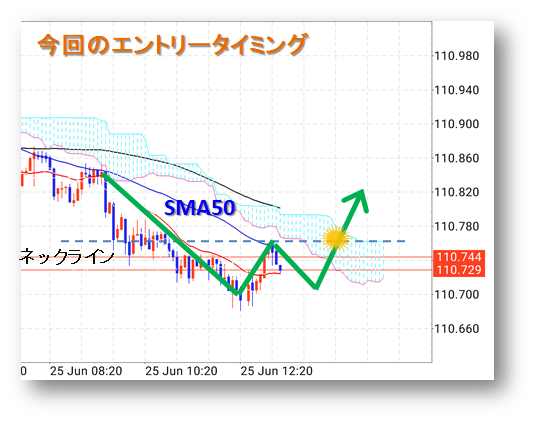 今回のトレードではそこを改善し、SMA50で抑えられた価格がネックラインになると考え、ダブルボトムを形成しネックラインを上抜くタイミングでエントリーしたいと思いました。