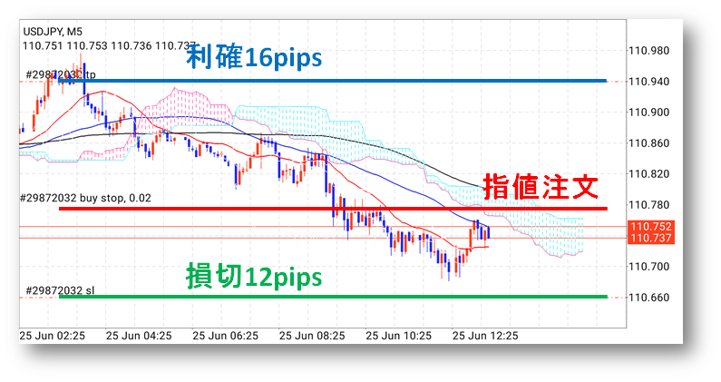 こんな感じでIFO注文しました。ネックラインになると考えたポイントのやや上方に再値注文を設定しました。利確は16pips、損切は12pipsです。0.02lotのロングエントリーです。