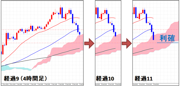 4時間足ではこんな感じです(経過9、10、11)。ニョキニョキと陰線が伸びていて、利確ラインに届こうとしています。今回は、充分伸びてくれたのでここで決済することとしました。理由としては、利確ラインにしっかりとした根拠がない。日足レベルでは上昇トレンドであるため、あまり深追いはしない方が良いと考えたからです。