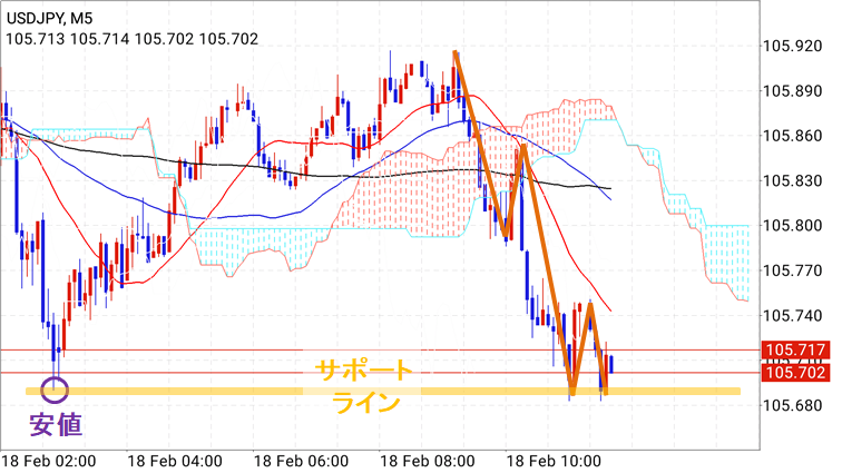 5分足では、高値・安値の切り下げられており、下降トレンドを形成しています。以前の安値付近に位置しており、これがサポートラインとして機能しています。